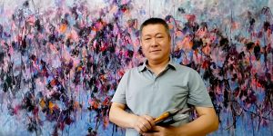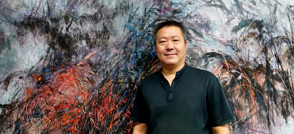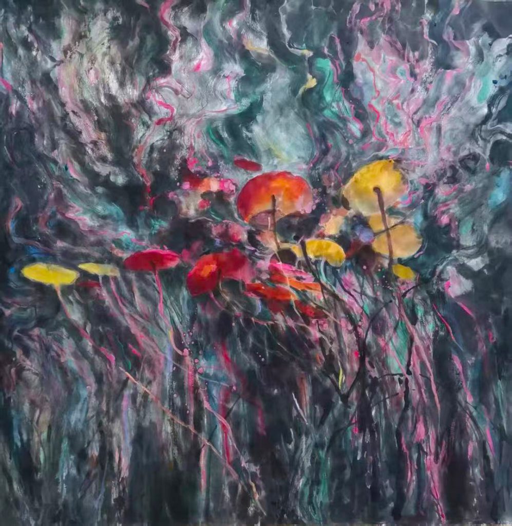 木然公先生闭关云游以来,沉积多年的思维感悟涌动勃发,一幅幅大尺寸作品中透着灵动震撼。一个创作型画家意念中独有的水墨语言逐渐形成,带有强烈色彩塑造性,在他的作品中,我们看到具有中华文化代表性的笔墨线条语言加以提炼,融合当代东西方文化的外光色彩,叠加到画面这个层次上,完成这个时代赋予的使命。