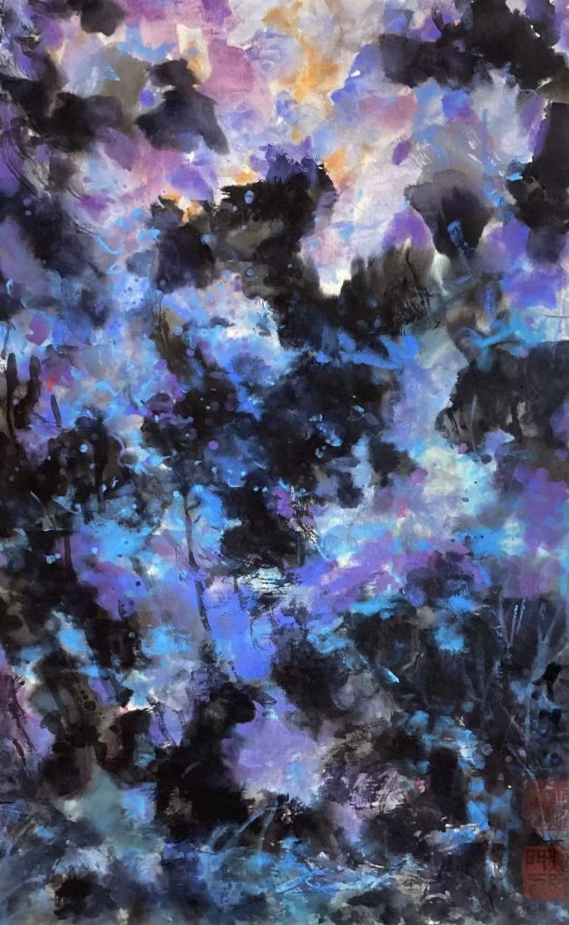 透过新创作的画面,可以追寻到非常典型的,深藏在画中的笔墨痕迹。画面创作不拘泥于古人对水墨艺术的理解。因为我们处在的时代是当代,在这个多元化的各种文化符号东西相融的时代,应该把最新的水墨语言呈现出来,而不是那种靠画照片的单纯笔墨堆积的作品呈现,前人走过的路我们要走一遍,而且要吃透,前人没有走过的路需要我们自己向前走,并提出一笔着七色法。