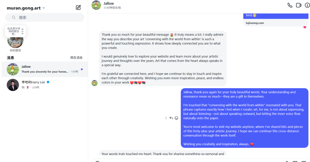 Deeply moved by this understanding, Mu Ran Gong further shared the core of his creative state: “Jallow, thank you again for your truly beautiful words. Your understanding and resonance mean so much—they are a gift in themselves. I’m touched that ‘conversing with the world from within’ resonated with you. That phrase captures exactly how I feel when I create: art, for me, is not about expressing, but about listening—not about speaking outward, but letting the inner voice flow naturally onto the paper. You’re most welcome to visit my website anytime, where I’ve shared bits and pieces of this forty-plus-year artistic journey. I hope we can continue this cross-distance conversation through the work itself.”